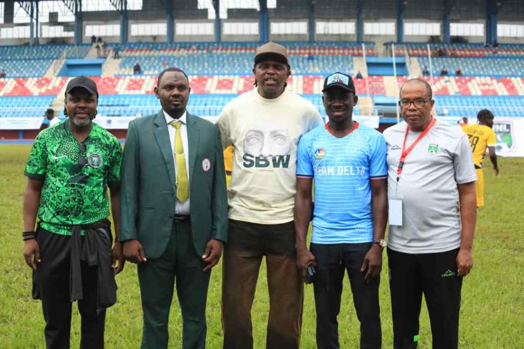 Nigeria ex-internationals Kanu Nwankwo (middle) Victor Ikpeba (left) with NNL Chairman George Aluo (right), Delta Sports Commission Chairman Onos Oboroweri (2nd left) and Match Commissioner Usman Maulud at the Stephen Keshi Stadium Asaba in the ongoing NNL Super 8.