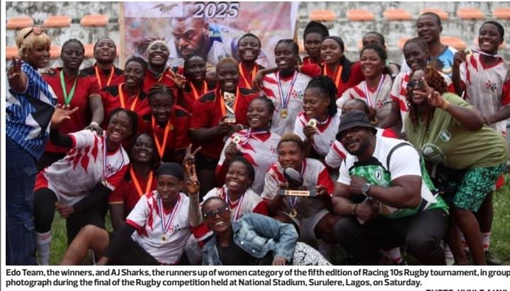 Edo women’s rugby team have won the ladies event of the 5th Edition of the Racing 10’s Rugby Tournament defeating their perennial archrivals AJ City Rugby team (Lagos State women’s rugby team) by 26-0. It was a nail-biting final game on Saturday, 2nd August at the Main Bowl of the National Stadium, Lagos.